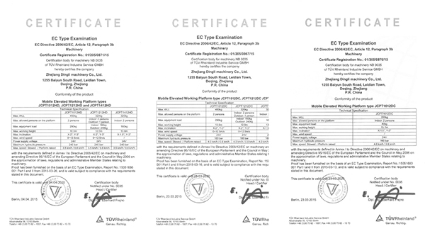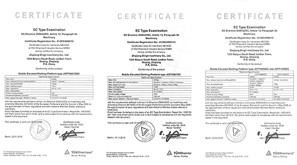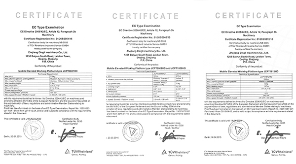 鼎力生産的全系列電動剪叉式高空平台通過了德國TUV萊茵公司的認證,并授予CE證書。浙江