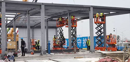 1月26日起,鼎力戰略合作夥伴宏信建發便緊急動員,第一時間攜鼎力設備奔赴現場,鋼構搭建、高空焊接、内部軟裝在鼎力設備的助力下,高空作業施工快速推進。
