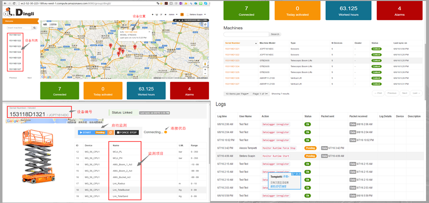 鼎力遠程監控與管理平台,采用(Amazon,亞馬遜)互聯服務器平台,具備全球互聯功能,能完全兼容和采集設備全部的信息狀态,實現真正遠程升級程序的能力。配合設備管理、服務支持、市場分析、統計管理(數據統計及權限管理)這四方面進行功能設計,通過GPS、移動網絡,對作業現場設備的位置、故障、報警等信息進行傳遞和管理,可以讓工程師足不出戶進行全球設備維護和信息互通。