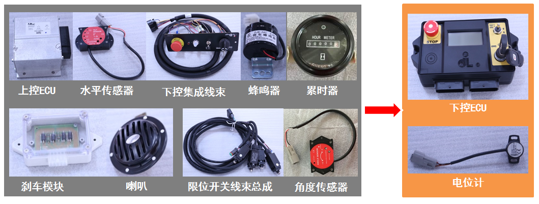 a、下控ECU集成冗餘水平傳感器、按鈕開關、鑰匙開關、急停開關、蜂鳴器、累時器、觸摸顯示屏、内置安全保險于一體;