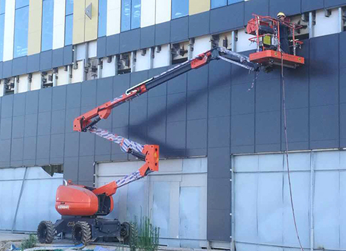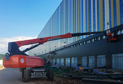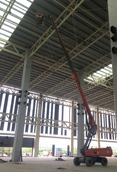 本次服務于長株潭煙草物流園項目的是鼎力GTBZ18A和GTBZ28SI。GTBZ18A工作高度18m,平台載重230kg,水平延伸8.85m,跨越高度8.45m,小臂130°變幅,操作靈活方便。GTBZ28SI工作高度27.90m,水平伸距20.00m,工作載荷230kg,四輪驅動使其具備靈活的機動性,擺動橋底盤,40%的爬坡能力,轉台360度回轉,可方便跨越地面障礙物進行遠距離作業,特别适合建築業和工業應用。