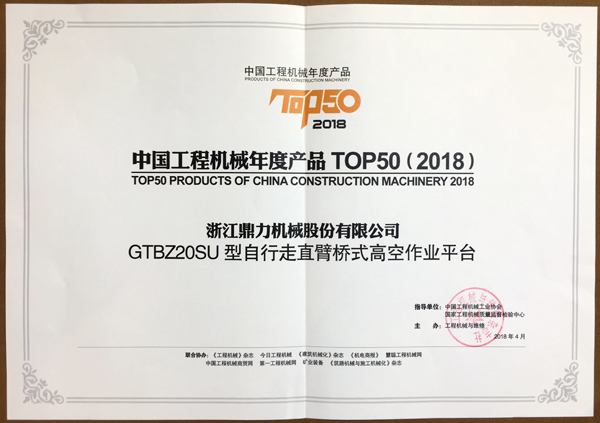 由《工程機械與維修》雜志發起并主辦的工程機械産品發展(北京)論壇暨中國工程機械年度産品TOP50評選活動,在業内最具活力和影響力。工程機械産品TOP50也是中國工程機械行業年度産品最高的榮譽獎項。浙江鼎力已經連續多屆,多款不同型号産品榮膺該獎項。