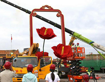 今年的花籃體量巨大:花壇頂高17米,籃體高15.3米,籃盤直徑15米,花壇底部直徑達50米。與以往選擇牡丹等中國傳統花材不同,今年為了慶祝改革開放40周年,首次選用紅掌,并用許多紅掌組合成一朵大花,寓意紅心向黨、團結凝聚在一起。擺放從9月14日深夜開始,鼎力高空作業平台也參與了此次巨型花籃的安裝工作。