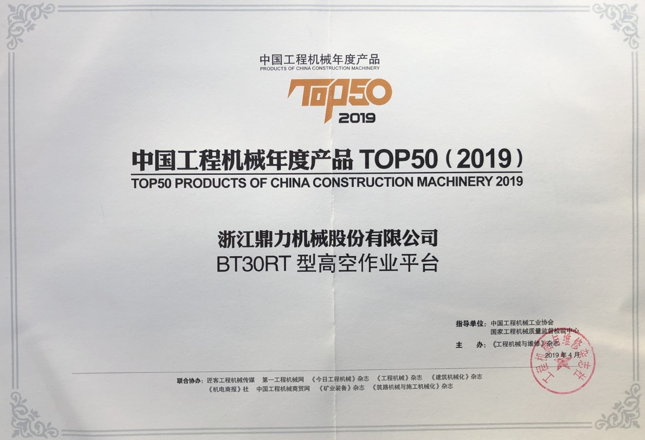 工程機械産品TOP50作為中國工程機械行業年度産品榮譽獎項,浙江鼎力已連續多年榮獲該獎項。