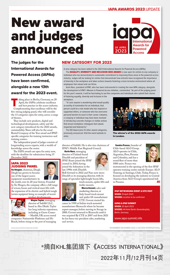 榮譽榜單丨首位中國評委,鼎力董事長許樹根入選 IAPA 2023 評審團!